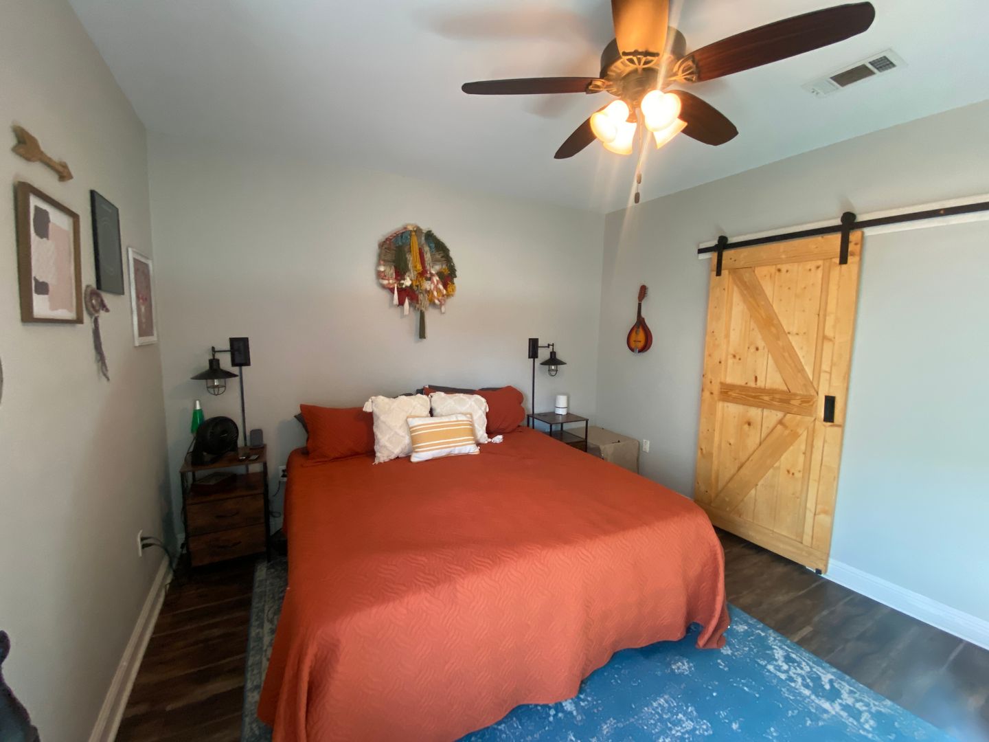 The master bathroom features a stylish barn door, adding character and privacy. Outdoor living is a highlight with a covered patio perfect for entertaining, a large backyard, and a storage shed. Additional storage is available in the patio attic, providing even more functionality.